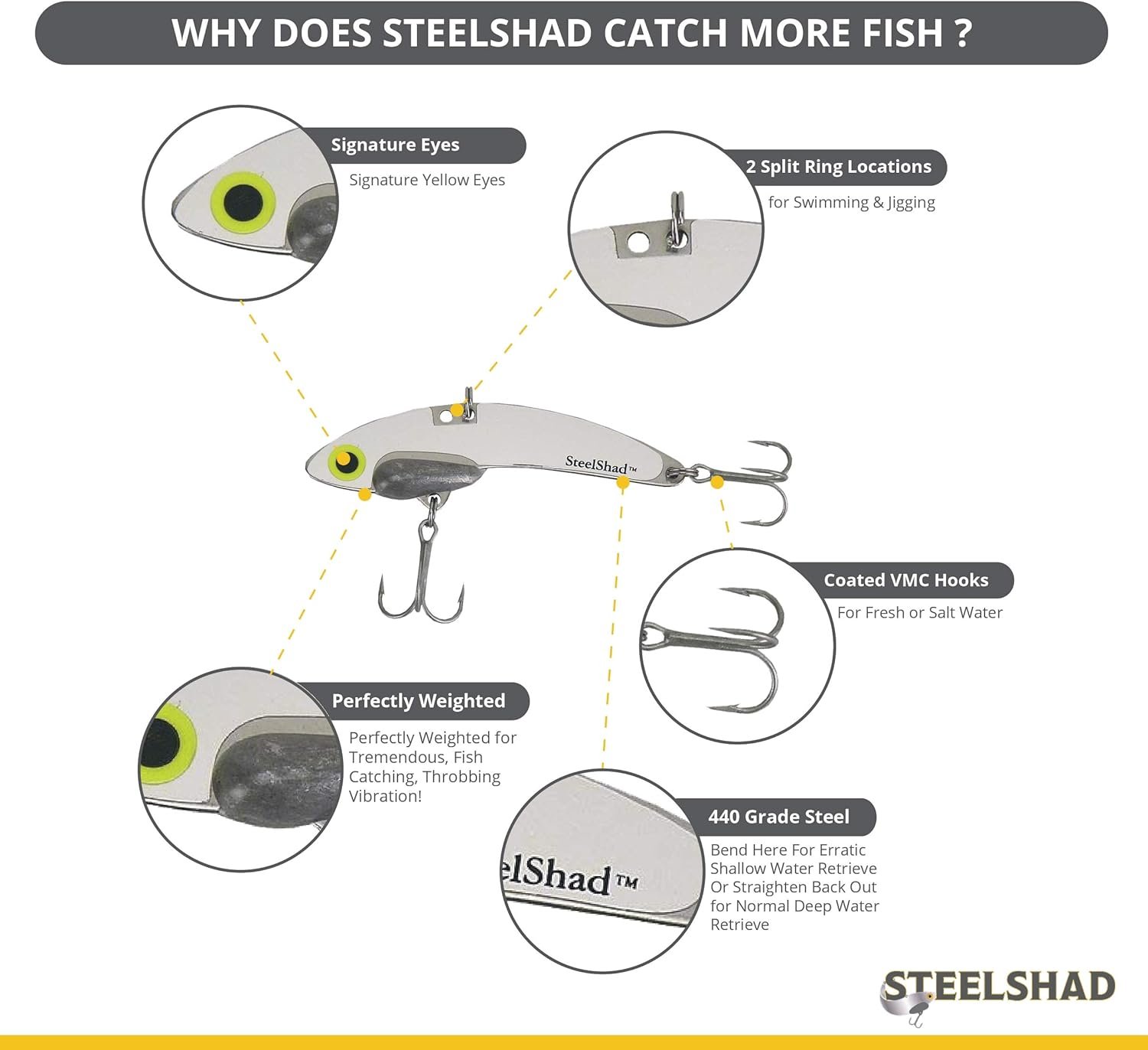 La mejor hoja: SteelShad Mini 1/4 oz. es de 1-3/10,2 cm de largo, hecho de acero inoxidable y llega equipado con ganchos recubiertos #12 VMC Permasteel, bueno tanto para la pesca de agua dulce como salada. El complemento perfecto para la caja de aparejos de cada pescador. Cada paquete contiene 2 señuelos. ENCENTRALLA. JIG IT. TROLLARLO. Aterrizarlo. El señuelo más versátil disponible hoy en día para desencadenar golpes de peces de agua dulce y salada. El acero inoxidable maleable y las múltiples posiciones de anillo dividido ofrecen formas de pescador de hacer que el señuelo nade frenéticamente poco profundo o profundo. Perfecto para jigging a través del hielo! Peformancia y versatilidad: este señuelo sin labios de alto rendimiento está diseñado específicamente para una intensa acción palpitante y desencadenar golpes de crappie, bajo, lucioperca, trucha, almizclado, lucioperca y striper. Mejor lanzamiento y jigging: desde el banco o el barco. El peso de SteelShad se coloca para un equilibrio perfecto y una acción vibratoria seductora. Los peces SteelShad Mini son excelentes en todas partes, especialmente en lagos de agua dulce, ríos y estanques. El regalo perfecto: disponible en 8 colores, el señuelo de bajo Mini SteelShad es el regalo perfecto tanto para principiantes como para pescadores experimentados.