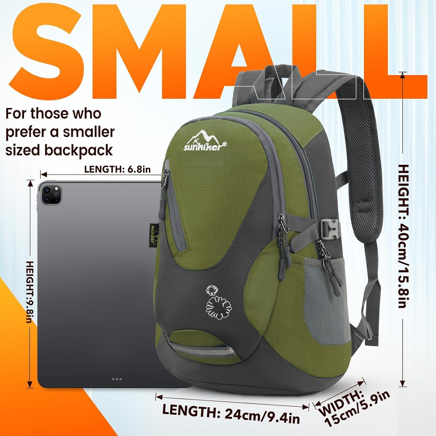 Dimensiones: 15.8 de alto x 9.4 de largo x 15,0 cm/40 x 24 x 15 cm. Peso: 12.3 oz. Capacidad: Alrededor de 20-25 litros. Es una pequeña mochila, adecuada para quienes no quieren cargar demasiado y solo necesitan unas cuantas cosas al hacer deportes al aire libre. Materiales: Nailon altamente resistente al desgarro, resistente al agua, ligero, resistente a los arañazos, duradero y cómodo. Proporciona un uso diario seguro y a largo plazo. Correas de hombro de malla transpirable que ayuda a aliviar el estrés del hombro. Múltiples compartimentos que ofrecen suficiente espacio para guardar tus pertenencias de clasificación más detallada y bien. Soporte para botellas en ambos lados. Con cremallera suave de alta calidad y hebilla frontal duradera. Perfecto para actividades como senderismo, acampar, escalar, viajes, ciclismo y otros deportes al aire libre.