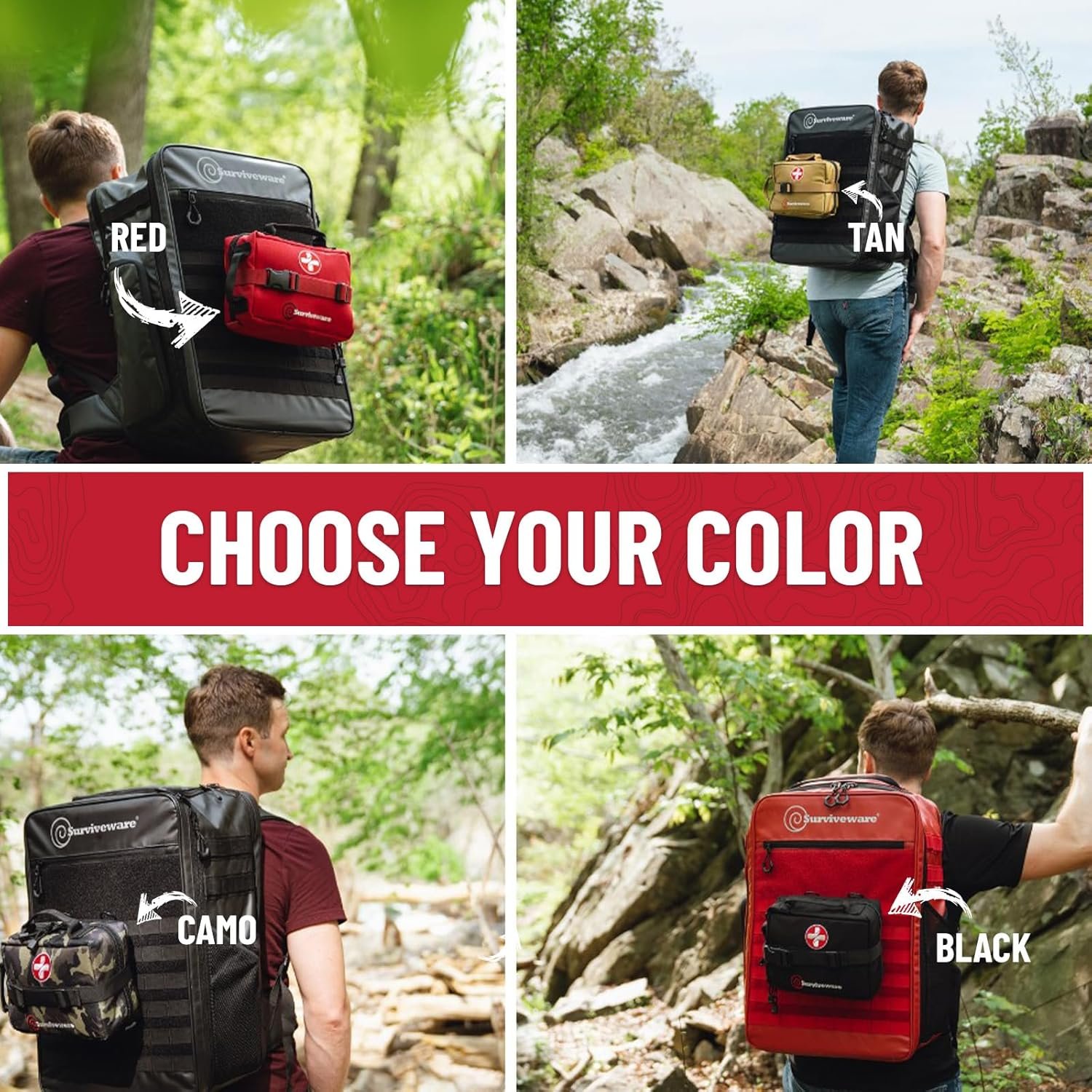 ¡Compartimientos bien organizados! Por primera vez, Surviveware presenta un kit de supervivencia con compartimentos etiquetados. El sistema está codificado por colores para ayudarte a mantenerte organizado. Esto significa que en una emergencia la bolsa toma las decisiones por ti. Mantente tranquilo y haz el trabajo con tranquilidad. Compatible con MOLLE: Con un sistema de velcro extraíble, puedes llevar este kit de primeros auxilios en tu mochila táctica o adherirlo al material de tu maletero. El velcro es lo suficientemente fuerte para que puedas llevar este kit verticalmente sin que se deslice. Además, este sistema incluye anillas en D para fijarlo a la barra estabilizadora de tu ATV o camión. Preparación al aire libre. ¿Vas a solo? ¡No hay problema! Esta bolsa organizada tiene todo lo que necesitas para sobrevivir y crecer. Contiene artículos de supervivencia, primeros auxilios e higiene. Todas tus necesidades están cubiertas. También incluimos los mejores suministros y equipo de supervivencia. ¡Sé el héroe! Sí, se siente bien ser un héroe, especialmente con el equipo y las herramientas para ir al rescate durante los momentos difíciles. Este kit está equipado con todos los suministros de primeros auxilios de nuestro pequeño kit legendario de primeros auxilios y algunos más. También hemos añadido un apósito para quemaduras y una linterna (no incluye baterías) en caso de que tengas que trabajar en la oscuridad. Aprobado por la FSA y la HSA. Nuestros kits de primeros auxilios de supervivencia están 100% aprobados por la HSA y la FSA. ¿Por qué no invertir en un gran kit de primeros auxilios de supervivencia y utilizar tus fondos de la FSA y la HSA?