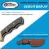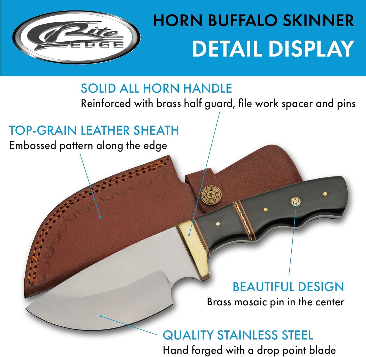Dimensiones: 20,3 cm de longitud total con un mango de 10,2 cm. 10,2 cm de longitud de la hoja, 3,8 cm de ancho y 0.157 in de grosor. Construido resistente: este cuchillo de caza cuenta con una hoja forjada a mano de punta de caída completa hecha de acero inoxidable de calidad tratado para una retención óptima de los bordes y durabilidad. Mango: Este cuchillo de camping cuenta con un mango sólido y ergonómico hecho de cuerno acentuado con pasadores de latón, refuerzos y espaciadores para un agarre sólido antideslizante. Funda: Acompañado con este cuchillo de supervivencia hay una funda de cuero auténtico hecha con cuero de grano superior y trabilla para cinturón para un almacenamiento y viaje rápidos y fáciles. Aplicación: Este es un cuchillo ideal al aire libre para todas las actividades al aire libre como camping, senderismo, pesca, caza y más. Seguro que será una excelente adición a cualquier colección de cuchillos para el entusiasta de los cuchillos en tu vida.