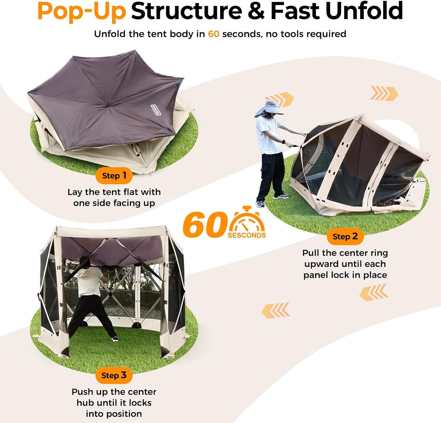 Configuración emergente instantánea en minutos: olvídese de postes o herramientas complicados: la carpa plegable Teccom cuenta con un marco automático para una configuración rápida en solo 60 segundos. Incluso los principiantes pueden terminar el montaje en cuestión de minutos, perfecto para acampar, picnics, barbacoas o festivales, te permite disfrutar más tiempo al aire libre y menos tiempo luchando con la configuración. Refugio ventilado y privado: la tela de malla de alta densidad B3 bloquea los mosquitos mientras mantiene el flujo de aire y una visibilidad clara. Este cenador de camping viene con 7 paredes laterales extraíbles para privacidad y protección contra la intemperie. Dos paredes laterales con ventana te permiten cambiar fácilmente entre descansar al aire libre y una casa de pantalla cerrada. Protección UV y resistente al agua: esta tienda de campaña está hecha de tela Oxford 300D, bloqueando hasta el 99% de los dañinos rayos UV. Sus esquinas reforzadas a prueba de lluvia garantizan una impermeabilización confiable y mantienen la tienda seca, por lo que es el refugio perfecto a prueba de insectos para el ocio en el patio trasero y campamento. Nota: Por seguridad, evite usar la glorieta en fuertes lluvias o tormentas. Estructura robusta y alta estabilidad: el toldo desplegable de 6 lados está construido con un marco de acero fuerte y postes de fibra de vidrio, y viene con 11 estacas profesionales y 6 cuerdas de viento duraderas para garantizar la estabilidad incluso en condiciones de viento. Las cremalleras suaves de doble cara y el velcro ensanchado proporcionan un cierre seguro, ofreciendo una experiencia al aire libre más segura y agradable. Espaciosa glorieta exterior de 10×10 pies: esta glorieta de camping se adapta cómodamente a 6-8 personas. Combínalo con una mesa de picnic, sillas o muebles de salón para grandes reuniones, fiestas, campamentos, barbacoas o relajarse al aire libre. Utilízalo como cenador sombreado durante el día e instala las paredes laterales para crear una tienda privada cerrada por la noche.