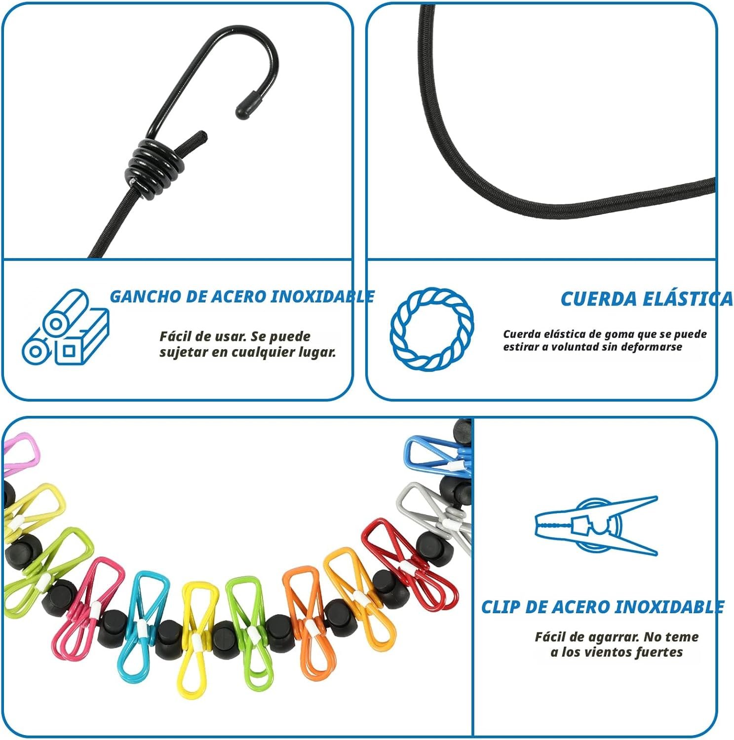 Diseño creativo: tendedero portátil con 12 pinzas coloridas, 13 clips antideslizantes que pueden ser resistentes al viento, diseño con cuentas de posicionamiento, se puede mover suavemente de izquierda a derecha, la cuerda negra es elástica y se puede estirar hasta 10 ~ 12 pies, no hay necesidad de preocuparse de que la ropa se amontone debido al peso o al viento y mejora el efecto de secado. Fuerte y duradero: tendedero resistente fácil de sujetar con dos fuertes ganchos de material de acero inoxidable y fácil de quitar, nuestro tendedero sin clavijas se puede fijar en cualquier lugar: casa, balcón, baño, patio trasero, hotel, dormitorio de estudiantes, lavandería, es un buen artículo de campamento para interior o exterior, facilita el lavado, almacenamiento y organización de la ropa. Fuerza de sujeción fuerte: diseño antideslizante con cuentas de posicionamiento, ganchos y pinzas para ropa, fuerte fuerza de sujeción, se utiliza para colgar diferentes tipos de ropa como toallas, pañales de tela, ropa interior, calcetines, mantas, pantalones, etc. No te preocupes por que el viento te vuele [Ampliamente utilizado] Pequeño, ligero y fácil de llevar, se aplica a dispositivos de caravana, línea de ropa retráctil al aire libre, tendedero de ropa para patio, decoraciones de caravana para interiores, accesorios de caravana para remolques de viaje, organizadores de caravanas para remolques de viaje, tendedero retráctil drynatural, línea de ropa de piscina, ideal para viajes, camping, uso al aire libre e interior. Imprescindible para campistas, remolques de campamento imprescindibles Calidad y satisfacción: tu compra está protegida. Si no estás satisfecho con nuestro tendedero portátil, puedes devolverlos en cualquier momento, lo mejoraremos a tiempo hasta que estés satisfecho