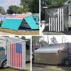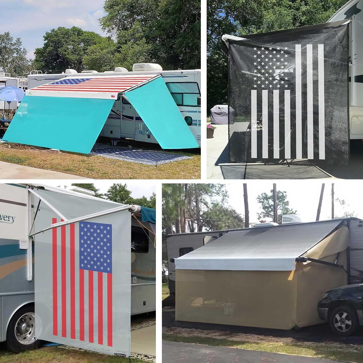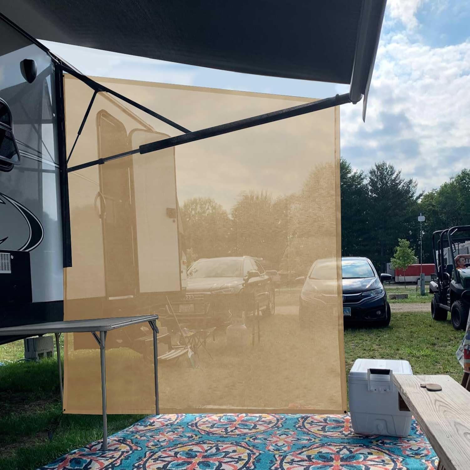 Bloqueo ultravioleta y visión abierta: se utiliza como toldo lateral de caravana, bloquea alrededor del 86% de los rayos ultravioleta para proteger nuestra piel y ojos, pero al mismo tiempo ofrece una visión amplia. Baja la temperatura: te proporciona un espacio amplio y acogedor a la sombra. Disfruta de tu tiempo cómodamente, incluso en días muy calurosos. Reduce el viento de manera eficiente: rompe especialmente la fuerza del viento cruzado. Obtienes una zona más acogedora cuando lo utilizas con nuestro toldo frontal. Fácil de instalar y desmontar: peso ligero y sensación cómoda en la mano. 2 estacas de plástico, cuerdas elásticas de 1-7,6 cm y 3-33,0 cm, 2 ganchos de aleación de zinc y 4 tornillos de perforación de acero inoxidable. Bolsa de almacenamiento incluida. Tamaño de la pantalla: Extensión de 7 pies y se adapta a la mayoría de marcas de toldos como Dometic, Carefree, Lippert, Fiamma, Solera, etc.