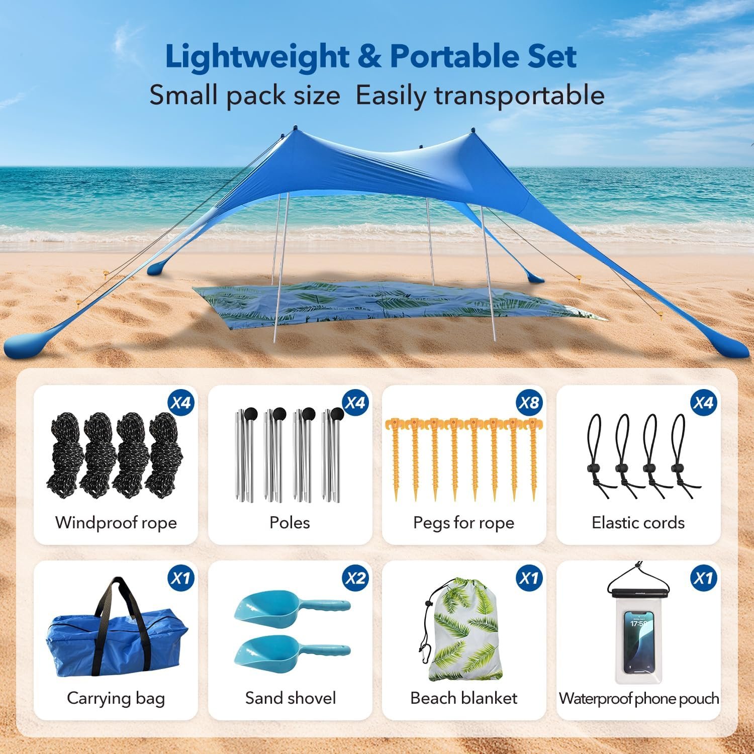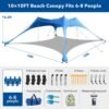Toldo desplegable multiusos: el toldo de playa incluye una manta de playa y una funda impermeable para teléfono, tienda de campaña de 10 x 10 pies que crea 100 pies cuadrados, se adapta cómodamente a 6-8 adultos. Diseño ligero que mantiene el toldo de playa portátil. Ideal para relajarse en la playa, patio trasero, junto al lago, perfecto para amigos, familiares y buenos momentos. Materiales de alta calidad y alta durabilidad: la tela de licra de alta calidad tiene alta elasticidad, estos materiales no temen estirarse ni romperse. Protección UV UPF 50+ y función resistente al agua. Postes de aluminio reforzado a prueba de óxido y esquinas reforzadas para una larga duración Fácil de instalar y portátil Guiado por las instrucciones de la tienda de campaña de playa, el toldo de playa está disponible en dos métodos de instalación: 4 postes o 2 polos y se puede instalar por una sola persona en 5 minutos. Los postes cónicos reforzados unidos con un cordón elástico que evita el movimiento, las estacas de tierra y los anclajes de saco de arena rellenables hacen que la playa sea más estable. El parasol para la playa viene con una bolsa de transporte compacta impermeable de 45,7 cm sobre la marcha. Protección solar fiable UPF50+: la tela de licra de poliéster de alta elasticidad tiene protección UV UPF 50+, bloquea los dañinos rayos UV para reducir las quemaduras solares o el deslumbramiento, por lo que es ideal para niños o adultos que se acuestan. Accesorio de sombra de playa resistente al viento de nivel profesional La tienda de campaña portátil con 4 postes de aluminio reforzado, 4 bolsas de arena grandes, 4 cuerdas resistentes al viento, 8 estacas, 2 palas de arena + bolsa impermeable. En este momento, la cuerda a prueba de viento, las patas del toldo y los postes de soporte forman un triángulo estable, lo que hace que la capacidad resistente al viento sea fuerte.