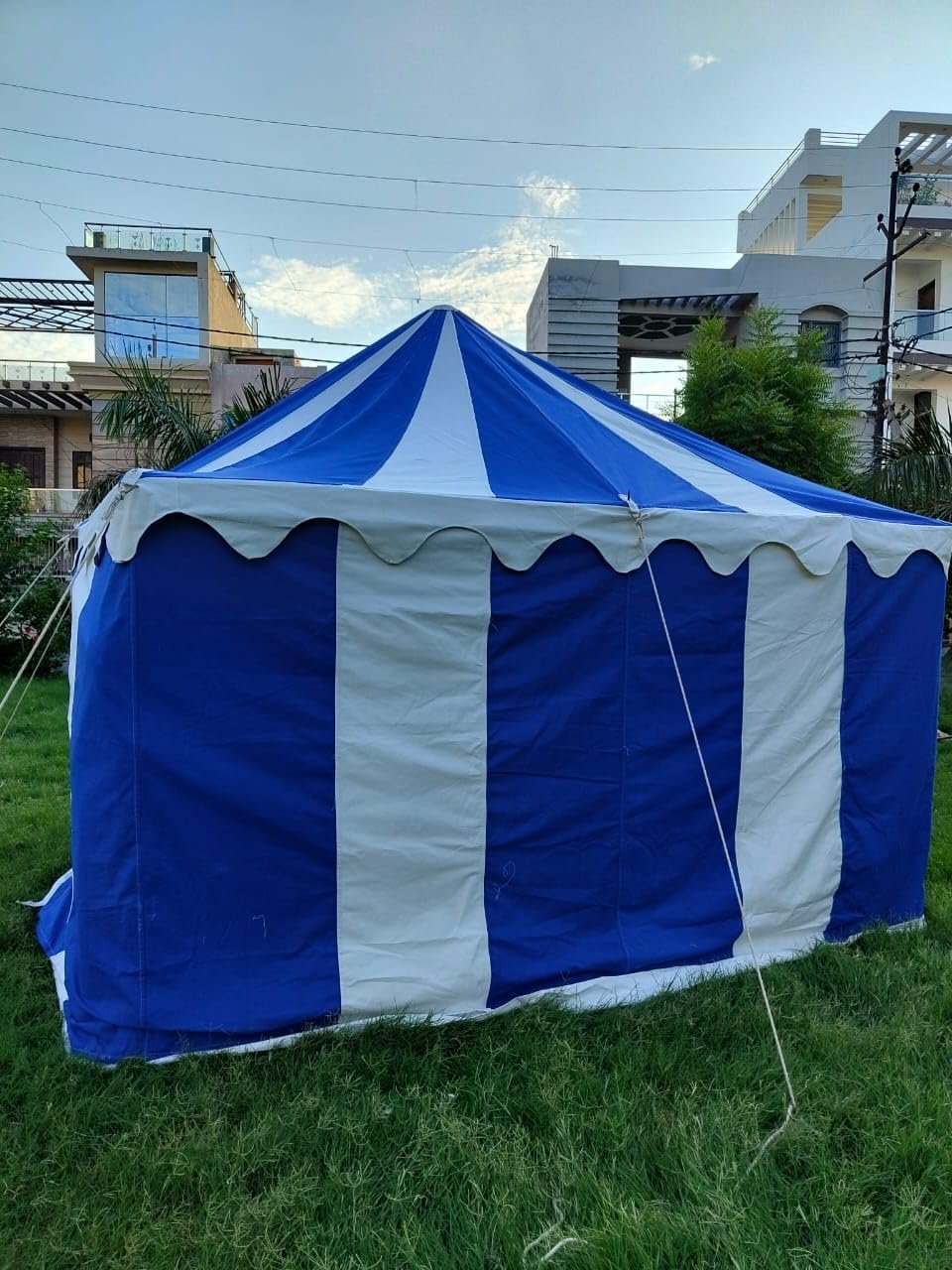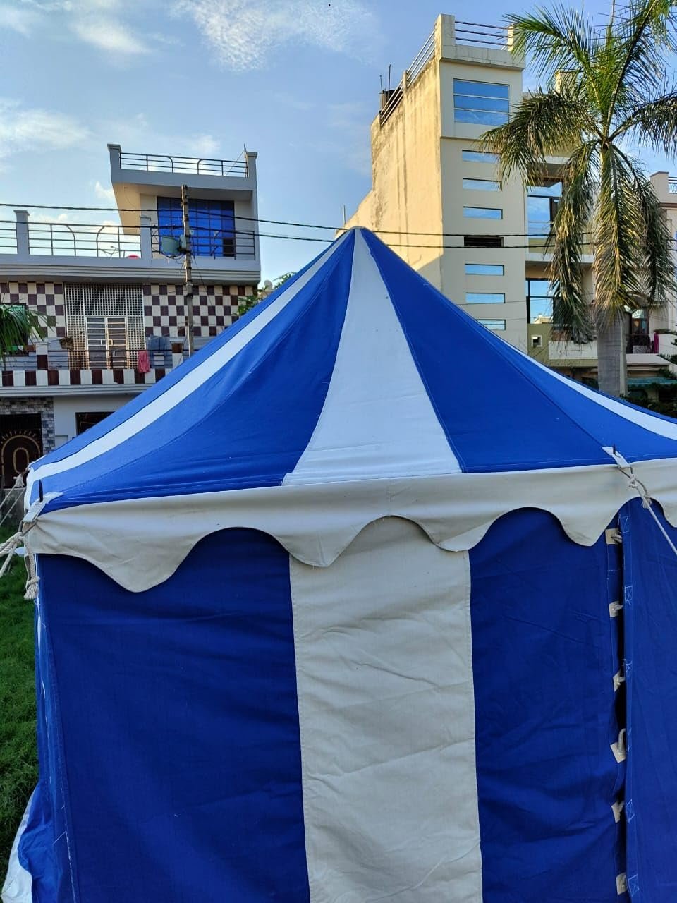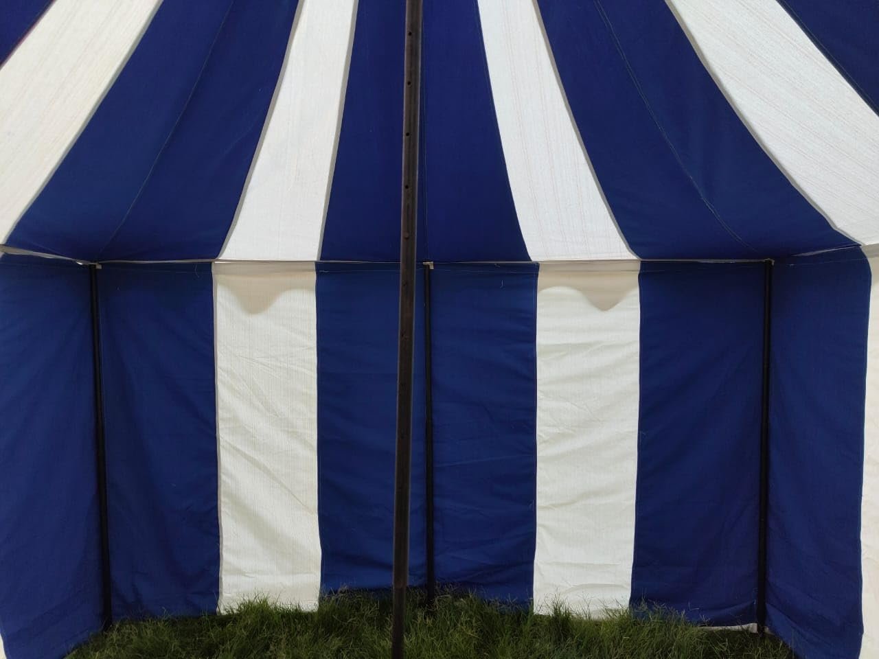 Tamaño: aprox. 9.8 x 9.8 ft Altura de la entrada: aprox. 5.9 ft Altura interior: aprox. 3 M US Altura lateral: aprox. 5.9 ft Lona de tienda que consta de 1 techo y 1 paredes laterales 10 pilas de hierro grandes Totalmente funcional y resistente al agua POLES NO INCLUIDOS