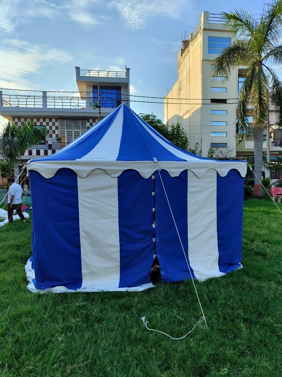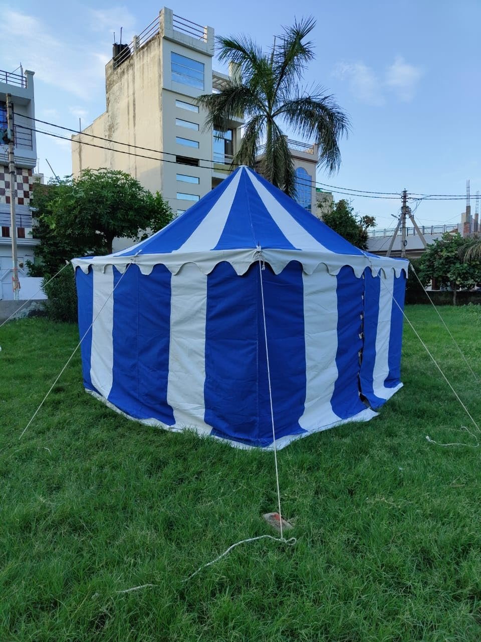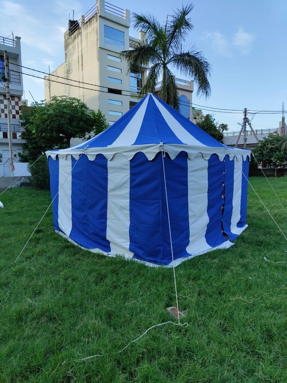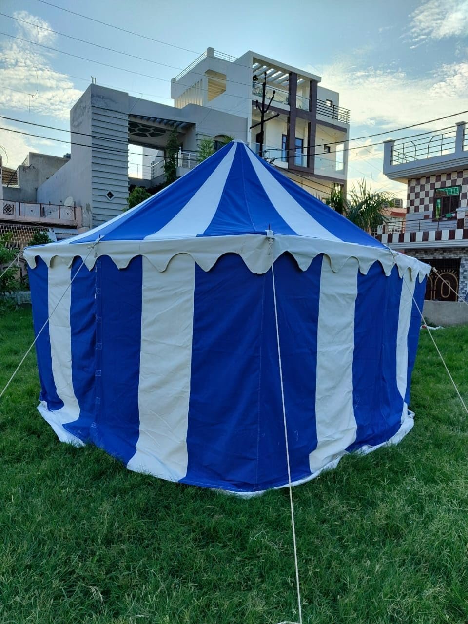 Tamaño: aprox. 9.8 x 9.8 ft Altura de la entrada: aprox. 5.9 ft Altura interior: aprox. 3 M US Altura lateral: aprox. 5.9 ft Lona de tienda que consta de 1 techo y 1 paredes laterales 10 pilas de hierro grandes Totalmente funcional y resistente al agua POLES NO INCLUIDOS