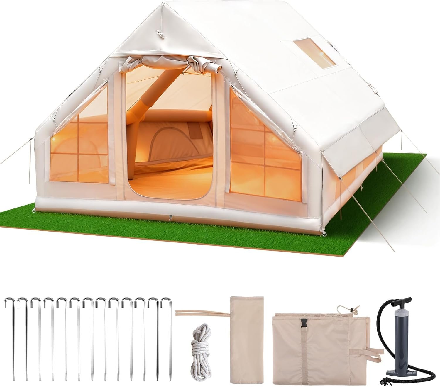 oxford tela Hecho en EE. UU. Protección para todo tipo de clima de grado profesional: Diseñado para la fiabilidad en diversas condiciones, esta tienda cuenta con tela Oxford 420D robusta con una clasificación de impermeabilidad de PU de 78.740 in. La construcción resistente a la intemperie proporciona una defensa excepcional contra la lluvia fuerte y la nieve, mientras que múltiples puertas y ventanas de malla fina ofrecen una ventilación óptima y una comodidad completa sin insectos. Diseñado como un verdadero refugio de 4 estaciones, mantiene un ambiente interior cómodo durante todo el año Configuración rápida de 5 minutos con sistema avanzado de haz de aire: experimente el futuro del camping con nuestro innovador diseño sin varillas. Las vigas de aire integradas de TPU y el sistema de doble válvula funcionan con la bomba de alta presión incluida para lograr una configuración completa en solo 5 minutos. Esta revolucionaria tienda de campaña de instalación rápida elimina la frustración del montaje tradicional de poste, por lo que es la solución definitiva de campamento fácil para viajes familiares y aventuras espontáneas. Sistema completo de camping todo incluido: su solución de aventura definitiva llega completamente preparada. Este kit completo de camping incluye la tienda de campaña inflable, bomba de mano de alto flujo, estacas resistentes y una bolsa de transporte compacta para un almacenamiento y transporte eficientes. Diseñado pensando en la practicidad, este refugio portátil está listo para la aventura para vacaciones familiares, festivales de música y viajes a la playa. El conjunto de equipos todo en uno garantiza que tengas todo lo necesario para experiencias al aire libre sin fisuras Estabilidad diseñada con tecnología avanzada de haz de aire: descubra una integridad estructural superior con nuestras columnas de aire de TPU de alta presión. Esta tecnología de haz de aire crea un sistema de soporte interconectado que demuestra un rendimiento excepcional a prueba de viento, superando a las tiendas de poste tradicionales en pruebas de estabilidad. La construcción duradera garantiza un rendimiento confiable en condiciones difíciles, mientras que la bomba de mano incluida garantiza un fácil montaje. Diseño espacioso optimizado para 4-12 campistas: con 128 pies cuadrados de espacio diseñado inteligentemente y una altura máxima de 6.5 pies, esta gran tienda de campaña acomoda cómodamente 6 sacos de dormir u 8 ocupantes para actividades. El diseño estratégico y los paneles de malla de alta densidad crean un interior transpirable y bien iluminado que mejora la comodidad de campamento familiar. Perfecta para salidas grupales y experiencias de glamping, esta espaciosa tienda de campaña ofrece la amplitud y la privacidad necesarias para estancias prolongadas