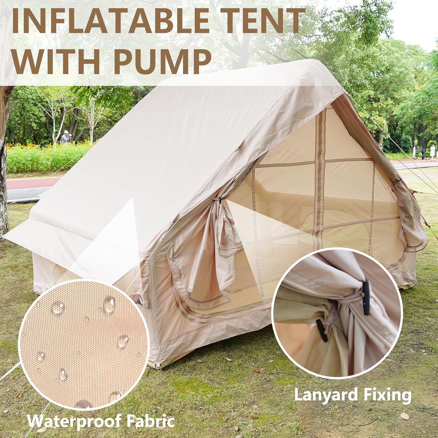 Oxford tela Importado Amplio refugio familiar: generoso interior de 299,7 cmx 199,9 cm que se adapta cómodamente a 4-6 adultos con equipo. Incluye bolsa de almacenamiento portátil (71,1 cm x 38,1 cm x 50,8 cm empaquetada). Sistema de inflado rápido: cuenta con 2 tubos de aire de TPU reforzados (bomba manual incluida) para una configuración de 5 minutos. No requiere postes – 30% más rápido que las tiendas tradicionales. Protección para todo tipo de clima: tela Oxford 410D con clasificación impermeable de 118.110 in y protección solar UV50+. Las cremalleras SBS garantizan un sellado completo contra la intemperie. Ventilación optimizada: 12 ventanas de malla de doble capa + 2 puertas en forma de D con solapas de privacidad. El flujo de aire ajustable evita la condensación mientras mantiene la privacidad. Durabilidad de 4 temporadas: soporta temperaturas de 14.0 °F a 104.0 °F. Falda resistente al viento y esquinas reforzadas que proporcionan estabilidad en vientos de 35 mph.