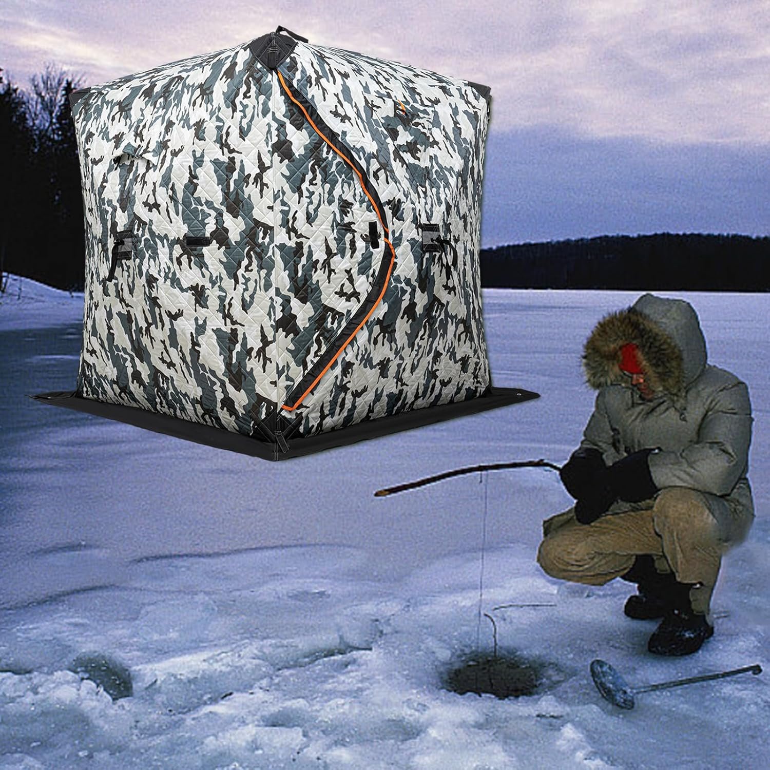 Construido para durar : este producto está hecho de tela Oxford 210D de alta calidad y varillas de fibra de vidrio, que pueden resistir la lluvia, el viento y la nieve y es resistente y resistente al desgarro, por lo que puedes usarlo durante mucho tiempo. Diseño cuidadoso: con su puerta en forma de D y diseño de doble cremallera, abrir y cerrar la tienda es muy fácil. Dos ventanas con cinta adhesiva y una cubierta enrollable se pueden abrir y cerrar fácilmente, lo que te permite disfrutar de una excelente luz al pescar en la tienda. Las esquinas reforzadas y gruesas lo hacen más duradero y garantizan una larga vida útil. Placer de compañerismo : el tamaño de 145,0 cm x 145,0 cm x 165,0 cm hace que sea capaz de acomodar 1-2 personas y otros suministros de pesca, por lo que puedes viajar junto con tus amigos para pescar y disfrutar de la diversión de la pesca. Protección completa: el dobladillo extendido y el algodón grueso de tres capas son cálidos y transpirables, por lo que también es una gran protección cuando estás fuera de pesca en hielo o llevas a los niños al parque para un picnic. Además, el paquete viene con una cuerda resistente al viento y anclajes de hielo para mantenerlo completamente estable incluso en climas ventosos. Portátil y ahorra espacio: el diseño plegable y una bolsa de transporte hacen que sea fácil para ti llevar el producto, y cuando no lo estés usando, puedes colgarlo en la pared de tu garaje o guardarlo en un armario sin ocupar demasiado espacio.