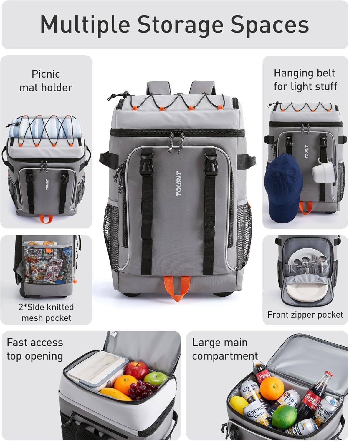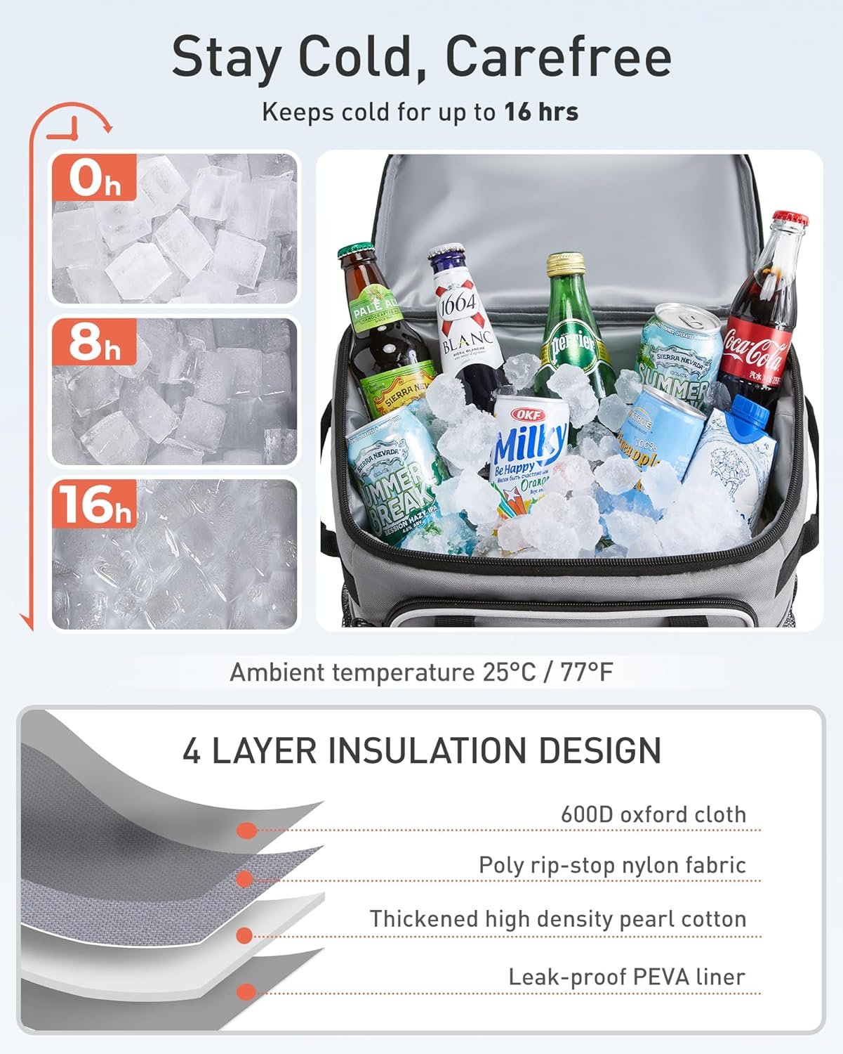 Mochila enfriadora rodante 2 en 1: experimenta una doble funcionalidad con nuestra mochila enfriadora rodante con correas ergonómicas para los hombros para una comodidad superior en comparación con la hielera pesada tradicional con ruedas. Equipado con ruedas resistentes y un mango telescópico oculto que se extiende hasta 100,3 cm (3.3 ft) y se bloquea en tres posiciones, se desliza sin esfuerzo sobre cualquier terreno. Dos opciones de transporte versátiles hacen que sea fácil llevar tu mochila térmica portátil a cualquier lugar. Gran capacidad de almacenamiento: diseñado como el mejor enfriador de playa, mide 33,0 cm x 27,9 cm x 45,7 cm con una capacidad total de 30 litros. Con un innovador diseño de doble capa, el compartimento superior de 6 litros puede contener hasta 8 latas de bebidas, mientras que la sección inferior de 24 litros es perfecta para almacenar comidas principales, aperitivos, frutas, cervezas y otros artículos esenciales, capaz de contener hasta 50 latas en total. Esto la convierte en una mochila ideal para todas tus aventuras al aire libre. Aislamiento de larga duración y 100% a prueba de fugas: nuestra mochila térmica aislada está construida con 4 capas de aislamiento de espuma gruesa y un forro interior de EVA a prueba de fugas, manteniendo tus alimentos y bebidas frescas hasta 16 horas mientras evita completamente fugas. Disfruta de aventuras sin preocupaciones con este confiable enfriador con ruedas a tu lado. Diseño de múltiples bolsillos: mantente organizado con el diseño inteligente de múltiples bolsillos de nuestra hielera con ruedas. La parte delantera cuenta con un bolsillo con cremallera diseñado para utensilios, lo que permite una separación efectiva en seco/húmedo. Dos bolsillos laterales de malla duraderos almacenan tus pequeños artículos esenciales, mientras que el compartimento superior de 6 litros cuenta con una apertura de acceso rápido y un cordón elástico cruzado superpuesto para asegurar tu manta de picnic. Además, la parte delantera incluye una rejilla de enganche para colgar artículos ligeros, manteniendo todo tu equipo al alcance. Versátil para cada aventura: más que una mochila con ruedas, este enfriador portátil es el equipo ligero perfecto para senderismo, camping, pesca, viajes, ciclismo y mucho más. Disfruta de la libertad de una hielera con ruedas que se adapta perfectamente a todas tus aventuras al aire libre.