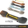 Paquete de 4 utensilios de tenedor 3 en 1 con una cuchara en un extremo y un tenedor con borde de cuchillo dentado en el otro. es un juego de utensilios completo en un tenedor compacto ultraligero Diseño ergonómico con materiales de nailon duraderos de grado alimenticio que hace que comer sea muy fácil para que puedas centrarte en las aventuras del día Los tenedores reutilizables UCO Utility son una forma ecológica de ayudar a reducir el uso de utensilios y cubiertos de un solo uso. Mantén los tenedores de plástico desechables fuera del entorno que todos compartimos y apreciamos Hecho de nailon de vidrio reforzado de alta resistencia sin BPA y ftalatos para mayor durabilidad y resistencia a la temperatura, y con un diseño apilable, incluye una correa elástica para asegurar y colgar para secar