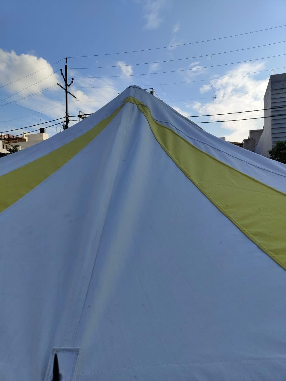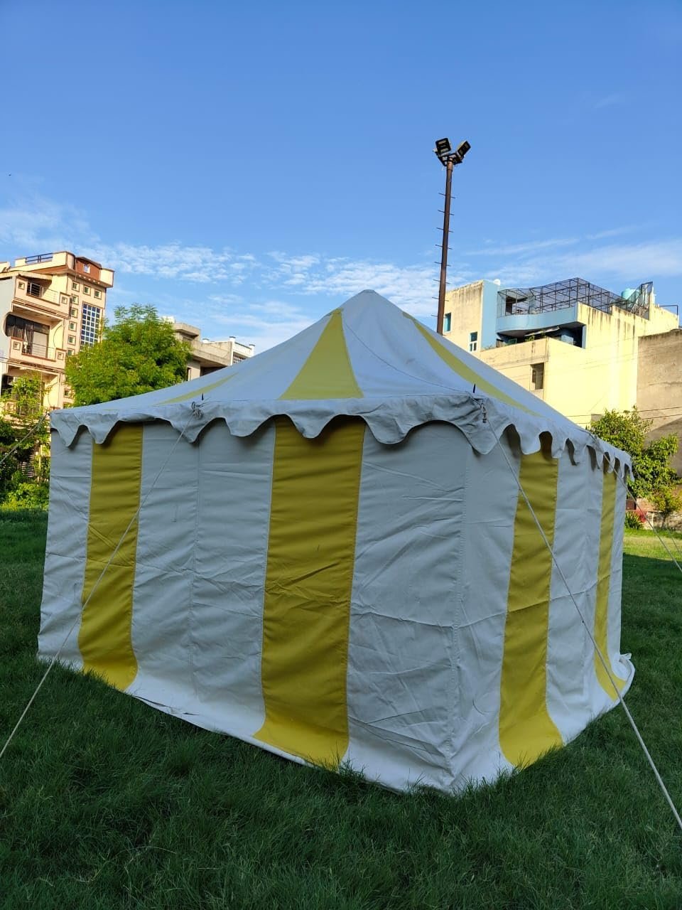 lona MADE IN INDIA Tamaño: aprox. 9.8 x 9.8 ft Altura de la entrada: aprox. 5.9 ft Altura interior: aprox. 3 M US Altura lateral: aprox. 5.9 ft Lona de tienda que consta de 1 techo y 1 paredes laterales 10 pilas de hierro grandes Totalmente funcional y resistente al agua POLES NO INCLUIDOS