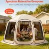 Espaciosa tienda de campaña emergente para 10 a 12 personas: Disfrute de una amplia tienda de campaña de pantalla que crea un relajante refugio al aire libre para 10 a 12 personas sin sentirse abarrotado. La gran tienda de campaña emergente de 12 x 11 x 7.55 pies es perfecta para diversión en el patio trasero, días de playa, asientos en la terraza, reuniones en el jardín, picnics y viajes casuales de campamento. Este espacioso toldo de tienda de campaña ofrece una sombra cómoda y un ambiente libre de insectos para familiares y amigos Tienda de campaña con toldo de pantalla estable con estructura lista para el viento: Construido como una tienda de campaña de pantalla emergente duradera, la fibra de vidrio reforzada y los postes de acero mantienen la estructura en posición vertical incluso en condiciones exteriores ventosas. El diseño superior curvado reduce la acumulación de agua y la flacidez, lo que hace que este cenador de casa de pantalla sea una opción confiable para patios, jardines, terrazas y configuraciones de sombra de campamento. Ideal para crear una sala de pantalla estable para uso en patio o camping Sala de pantalla emergente instantánea con fácil configuración y almacenamiento: esta tienda de campaña emergente instantánea se instala en segundos sin herramientas gracias al cómodo sistema emergente y los postes desmontables. El toldo portátil para sala de pantalla se pliega perfectamente en la bolsa de transporte incluida para un transporte sin esfuerzo y almacenamiento compacto. Perfecto para casas de pantalla de camping, picnics, actividades en el patio trasero o sombra rápida en patios, jardines y terrazas Tienda de mosquitera de malla de 360° con protección contra la intemperie: manténgase fresco y sin mordeduras con la malla de alta densidad de 360° completa utilizada en esta tienda de campaña de mosquitera al aire libre. Tejido Oxford 300D duradero que ofrece una protección impermeable y solar confiable, lo que te protege del sol y la lluvia ligera durante las actividades al aire libre. Una tienda de campaña versátil para exteriores con mosquitera adecuada para patios, mesas de picnic, asientos en el patio trasero y sombra de camping Tienda de campaña de pantalla portátil con kit completo de accesorios: este toldo portátil para sala de pantalla incluye 16 estacas de metal, 4 postes de fibra de vidrio, 1 correa, una bolsa de transporte de tienda, además de una bolsa de estaca y una bolsa de poste, todo lo necesario para una configuración segura y estable. Ideal para crear un recinto de pantalla para patio, un espacio de cubierta protegida o un refugio resistente sin insectos para reuniones al aire libre, viajes de campamento y relajación en el patio trasero Sala de pantalla al aire libre para patio, patio trasero, jardín y campamento: transforme cualquier área al aire libre en una cómoda sala de pantalla para su terraza, patio, patio trasero o jardín. Perfecto para reuniones, campamentos, fiestas, picnics o sombra de playa. Esta tienda de campaña también funciona como una casa de pantalla desplegable portátil para todo tipo de actividades al aire libre. NOTA: Esta tienda de campaña con pantalla emergente no incluye lámparas, cuerdas de luz o linternas de campamento; los accesorios de iluminación deben comprarse por separado
