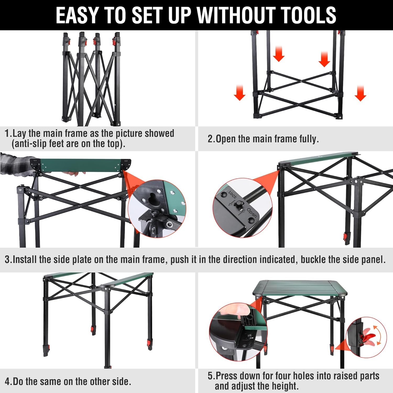 Ligera y portátil: con un peso de solo 4.0 libras, la mesa de camping plegable está hecha de aluminio y cabe fácilmente en la bolsa de transporte incluida, por lo que es la mesa de camping compacta perfecta para actividades al aire libre. Adecuado para camping, playa y fiestas en estacionamiento Construcción resistente: el marco de aluminio y el diseño de la mesa de aluminio garantizan durabilidad y estabilidad, soportando hasta 130 libras, lo que la convierte en una mesa de camping versátil que sostiene una parrilla y otros elementos esenciales de cocina Fácil de instalar: sin necesidad de herramientas, esta mesa de camping plegable es fácil de instalar, por lo que es ideal para picnics, barbacoas en el patio trasero y viajes de campamento. Adecuado para todo tipo de sillas y taburetes de camping, su altura ajustable hace que sea versátil Altura ajustable: la mesa de camping plegable está diseñada con 4 patas de aluminio retráctiles, por lo que es fácil de nivelar sin importar cuán desigual sea el suelo. Puedes ajustar libremente la altura de 15.7 a 50,8 cm, satisfaciendo todas las necesidades de campistas y aventureros Multiusos: esta mesa plegable de aluminio es perfecta como mesa de playa, mesa auxiliar de camping, mesa de portón trasero o mesa de playa portátil. Su parte superior enrollable hace que sea fácil de almacenar en una bolsa de camping o mochila. Las patas ajustables aseguran que se pueda utilizar como una pequeña mesa de camping o mesa de viaje