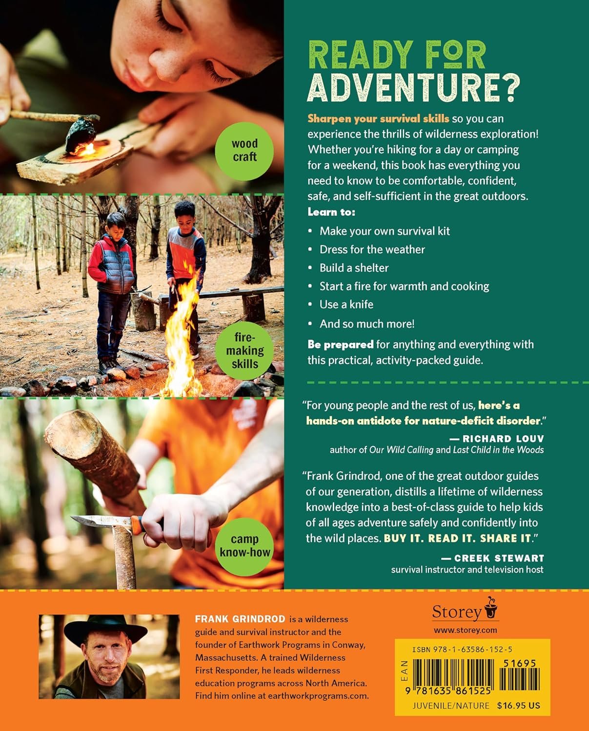 Whether in the rugged backcountry or a suburban backyard, kids can experience the sense of personal independence and self-confidence that come from outdoor proficiency, while also developing a deeper connection to and understanding of the natural world. With this skills-based book, kids learn essential safety and survival tips and bushcraft that they need to have a safe wilderness experience. Led by outdoor leader Frank Grindrod of Earthwork Programs, every turn of the page takes kids on another stage of the journey. They learn how to pack for the outdoors, navigate using a map and a compass, choose and set up a campsite, handle and use a knife properly, build a fire, tie different types of knots, make a lean-to out of sticks and leaves, and cook over an open fire. This guide teaches more than just outdoor know-how; it fosters appreciation for the natural world and pride in knowing how to use its resources as a tool for survival and adventure. Leer más