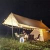 Lona, algodon. Dimensiones: altura 6.6 pies, piso 7.2 pies x 7.2 pies, peso 19.8 libras. Resistente al agua y con gato de estufa. Se abre en ambos lados, las grandes aberturas frontales y traseras para visión y ventilación. Compacto. Los postes se rompen en tres piezas, y esas tres piezas permanecen juntas. Viene con una funda de transporte para un fácil almacenamiento. Capacidad. Esta tienda de campaña de lona de algodón puede acomodar cómodamente a dos adultos para dormir. Se adapta fácilmente al colchón de aire de doble tamaño. 3-4 niños pueden dormir adentro. Perfecto para acampar al aire libre, así como fiestas en el patio trasero. Esta tienda de campaña también se puede instalar en un dormitorio para acampar en interiores Fácil de instalar solo. Dos personas lo hacen ir más rápido