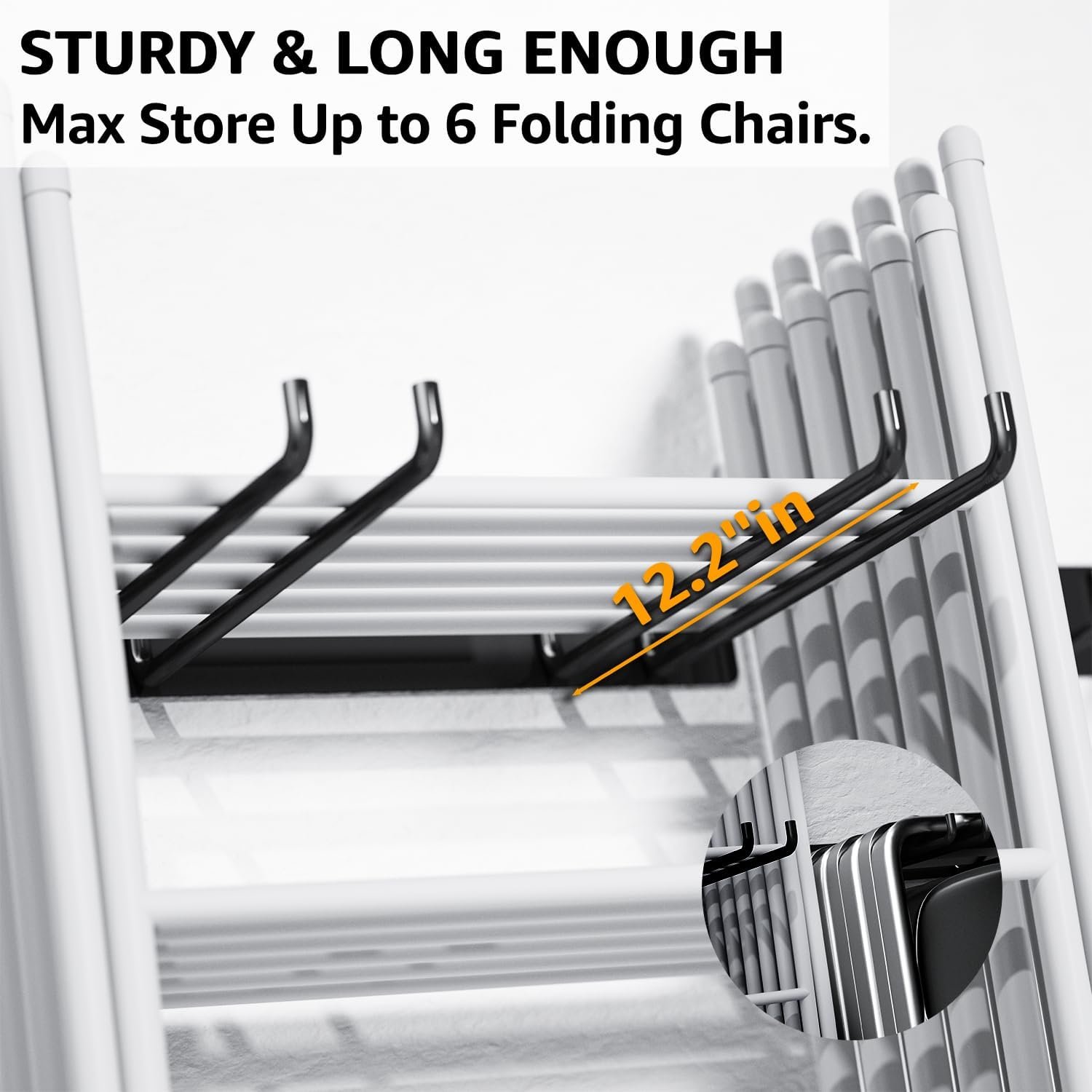 Ahorro de espacio: los ganchos de almacenamiento de utilidad de 31,0 cm de largo pueden almacenar hasta 6 sillas plegables cada uno. Ideal para guardar sillas de césped, sillas de playa, sillas de camping, sillas de patio y sillas de patio, etc. Ampliamente utilizado: el colgador de garaje YYR también es ideal para almacenar tus herramientas de patio como palas, rastrillos, herramientas eléctricas, escaleras y mucho más. No requiere montaje: el estante de almacenamiento sólido y soldado está listo para salir de la caja. Simplemente colócalo en la pared y carga tus sillas. Fácil de instalar: el soporte de pared plegable para silla simplemente se monta en la pared con los tornillos de calidad incluidos. Diseñado para asegurar a los pernos de pared estándar espaciados 40,6 cm de distancia. Resistentes: los ganchos de garaje YYR están hechos de acero sólido industrial. Cada par de ganchos puede soportar 120 libras, para un total de 240 libras, suficiente para sostener todas tus sillas plegables o herramientas.